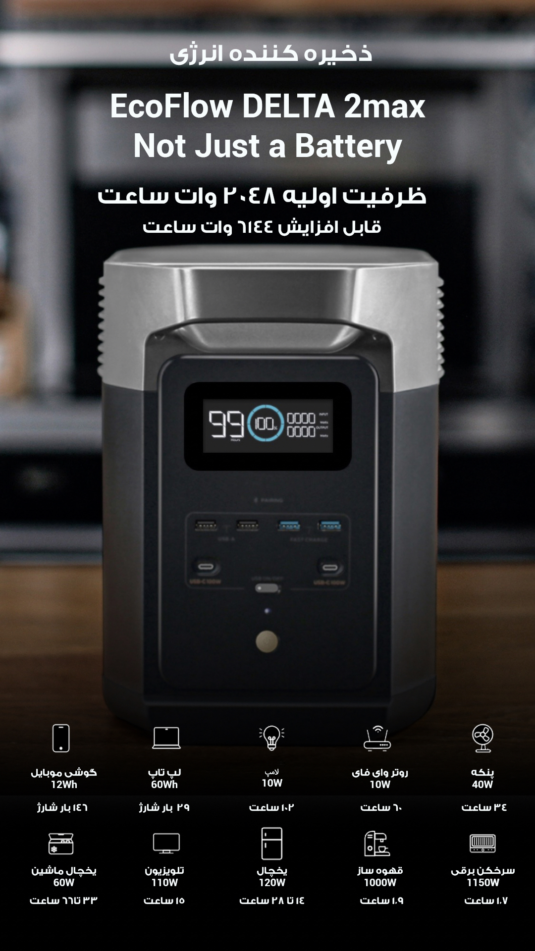 با ظرفیت 2048 واتساعت، میتوانید لوازمی مانند یخچال کوچک، لپ تاپ، تلفنهای همراه و حتی ابزارهای برقی کوچک را برای چندین ساعت مداوم روشن نگه دارید. این ویژگی در شرایطی که به برق شهری دسترسی ندارید، مانند مواقع قطع برق، کمپینگ یا سفرهای طولانی، بسیار کاربردی است و آرامش خاطر از دسترسی به برق را برای شما به ارمغان میآورد.
