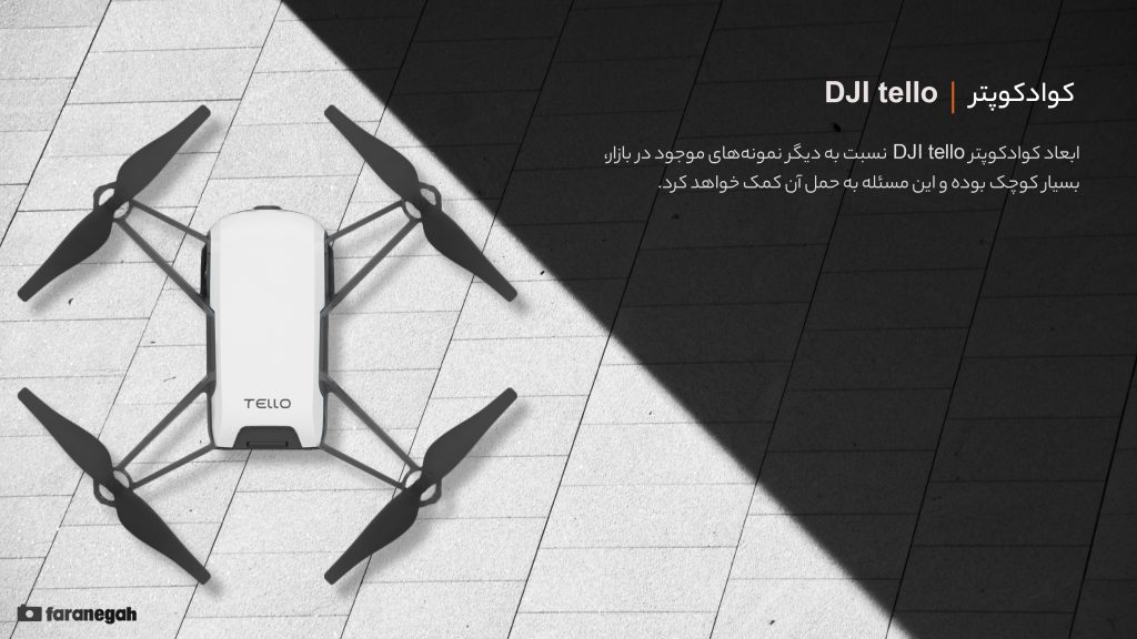 ابعاد کوادکوپتر DJI tello نسبت به دیگر نمونههای موجود در بازار، بسیار کوچک بوده و این مسئله به حمل آن کمک خواهد کرد؛ از سوی دیگر میتوان انتظار سرعت و چابکی بیشتری را از این پهپاد داشت.